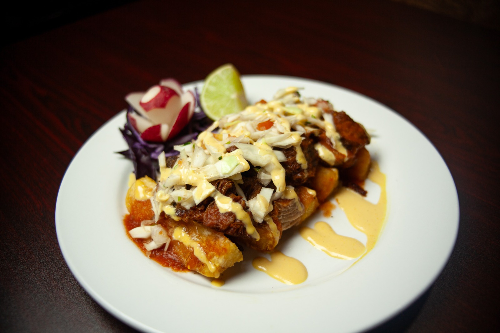 Two fried corn tortillas rolled and stuffed with your choice of shredded beef or chicken. Served with lettuce, guacamole, queso fresco and fresh tomato sauce.